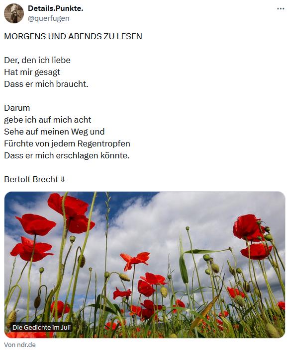 Morgens und abends zu lesen 4. Juli 2024 In Begleiten und Sorgen, Punkte Morgens und abends zu lesemDer, den ich liebeHat mir gesagt Dass er mich braucht.Darumgebe ich auf mich achtSehe auf meinen Weg undFürchte von jedem RegentropfenDass er mich erschlagen könnte.Bertolt Brecht. 1937 #Brecht, Bertolt #Einst gezwitschert #Poesie #Vom Alter(n) #Zugehörigkeit(en) So viele Abschiede bald für immer, gestern kam wieder so eine Nachricht … … dass ich weder glaube, sie begründen zu müssen noch zu sollen …